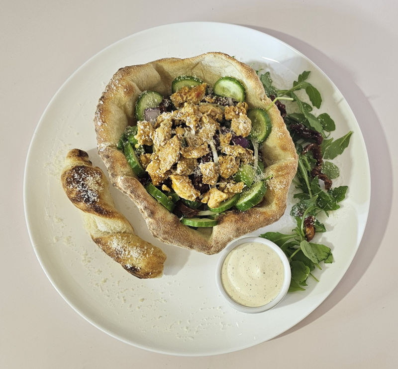 szarpana wieprzowina, chips z boczku, cebula, pieprz zielony, szczypior, papryka, pomidor, sos 420 wysp+chlebek